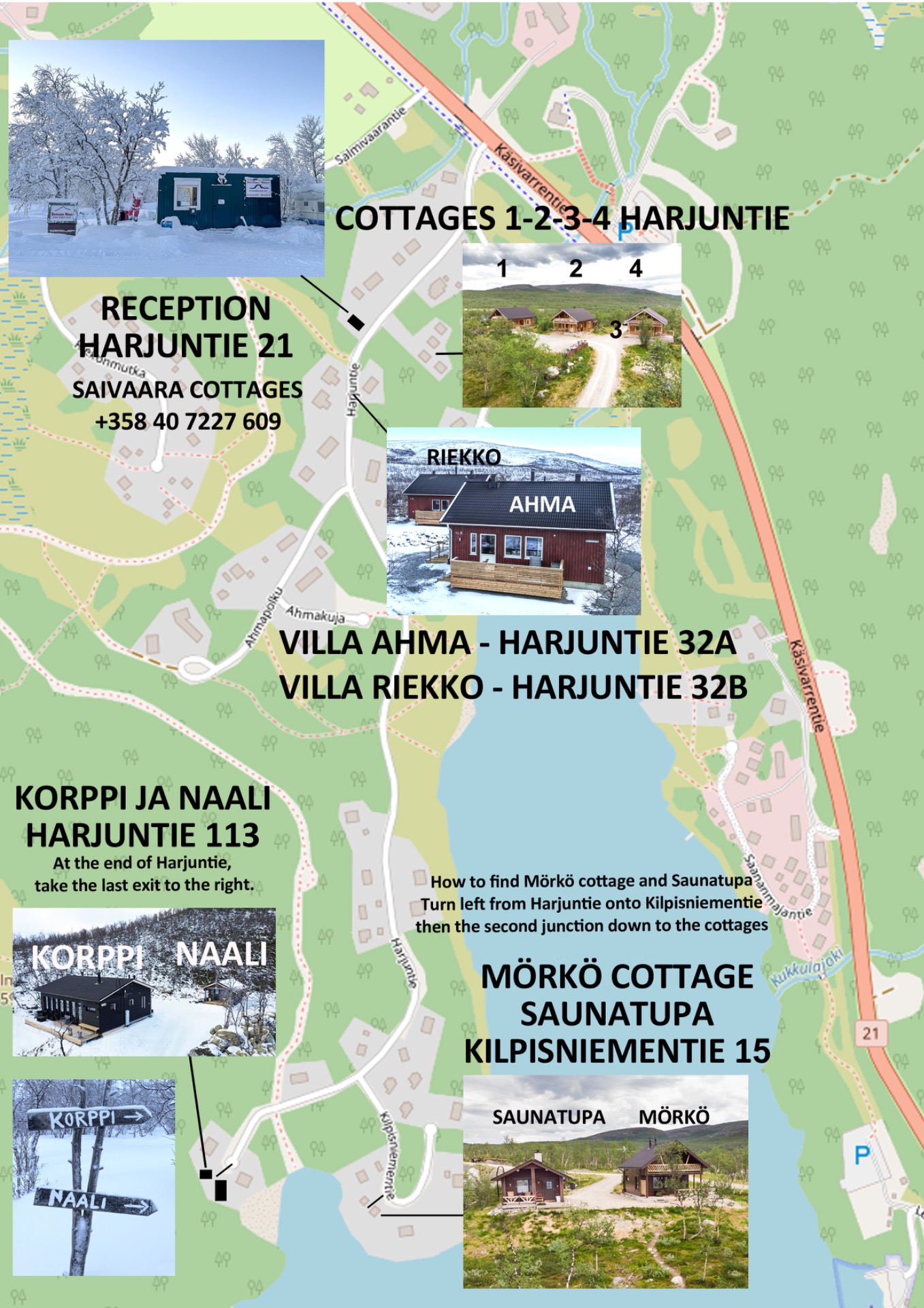 Saivaara Cottages/Safaris reception and rental office. Harjuntie 21 / +358 40 7227609